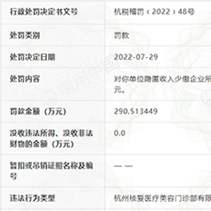 记者在信用中国查询发现,该处罚日期为7月29日,杭州市税务局对该企业隐匿收入少缴企业所得税4841890.81元的行为定性为偷税,并对少缴税款处百分之六十的罚款,计2905134.49元。