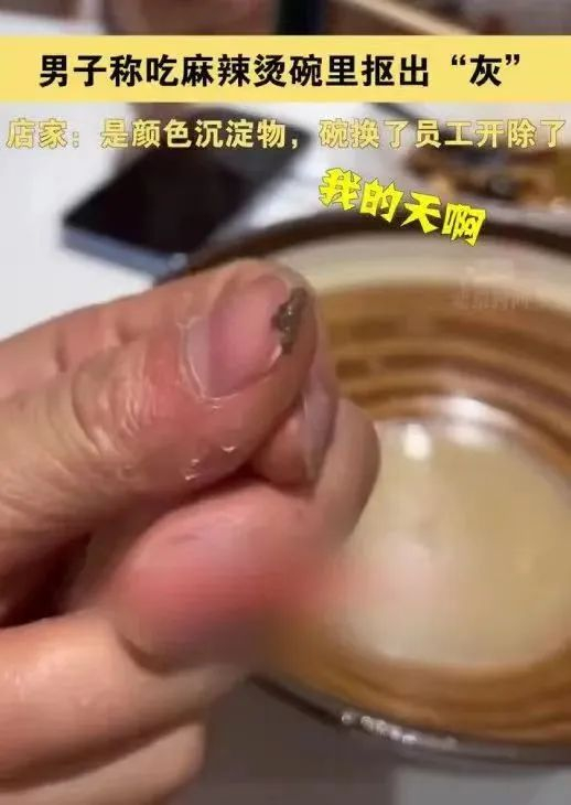 事情发生在安徽宿州。一顾客在张亮麻辣烫就餐,吃到最后发现碗底好像有一层污垢。于是,他好奇地上手抠了几下,这不抠不要紧,一抠抠出了一指甲盖“灰”。