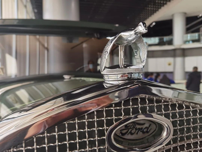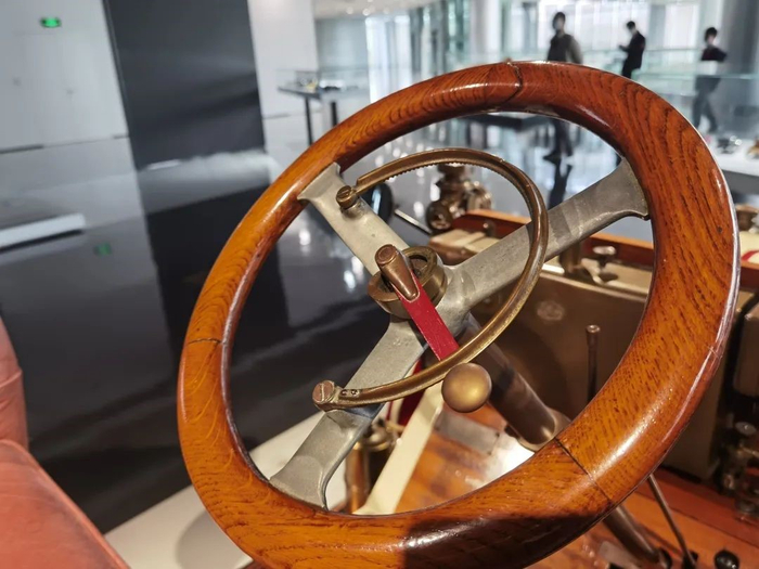 除了车辆,一些小的配件也充满了巧思与妙想。这是停放在上海汽车博物馆旋转楼梯长廊上的福特A型车,车标下方有一个类似温度计的透明指针,当水温过高时,透明指针会改变颜色,提醒车主该去修车了,有点类似现代车上的水温提示功能。