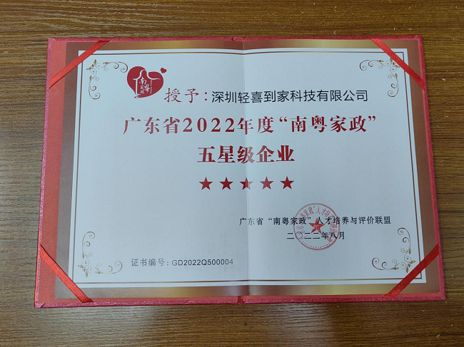 8月31日,广东省第二届“南粤家政”技能大赛总决赛闭幕式上公布了广东省2022年四星级、五星级“南粤家政”服务人员和企业认定名单,并进行了授牌仪式,深圳轻喜到家科技有限公司获“南粤家政”五星级服务企业认定。