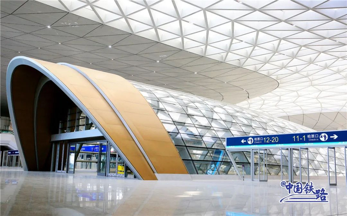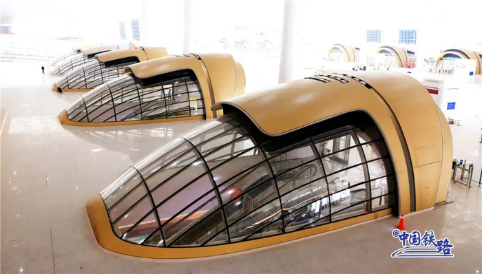 站房整体以“云之城”为设计理念,造型独特的检票口仿佛科幻大片中的太空舱。旅客进站乘车时会经过一道华丽的金色拱门,然后乘扶梯直达高铁站台层。