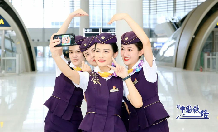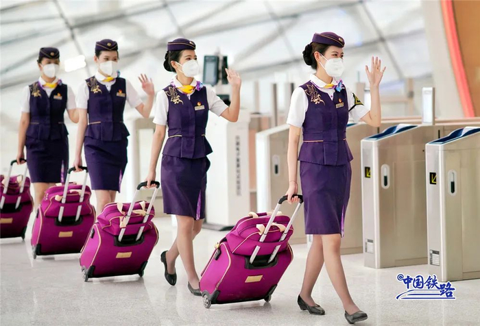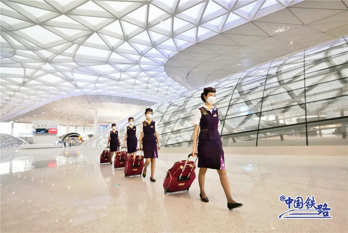 随着复兴号列车缓缓进站,4名身穿紫色制服的乘务员列队等候,这是试运行乘务工作团队正在进行站台接发列车模拟演练。