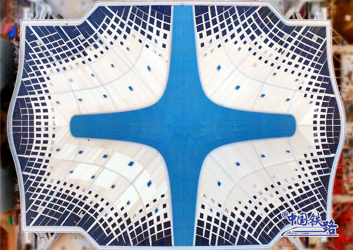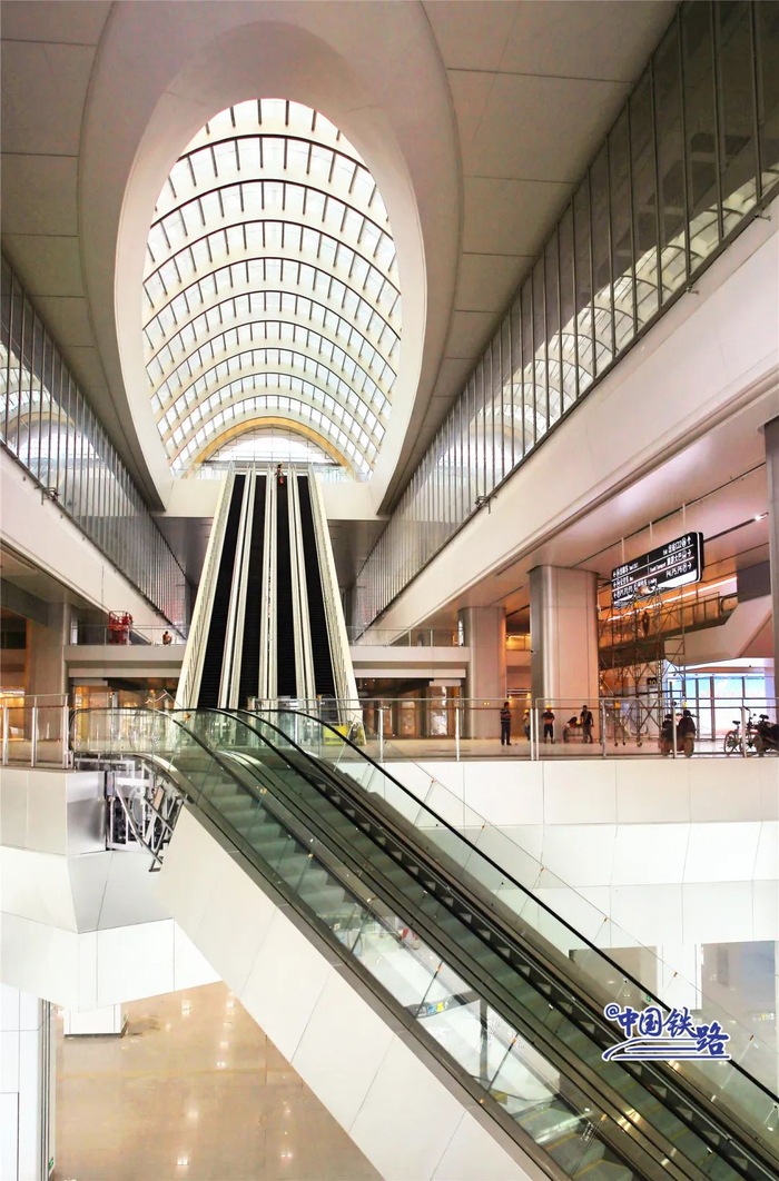 这样的“云谷”设计是基于车站轨道布局的一次创新,通过地铁、公交等公共交通方式进站的旅客不用绕道站房端部,从“云谷”乘坐扶梯就能直达中部候车厅。