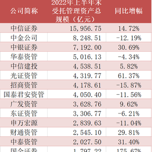 “一哥”中信证券坐拥万亿资管规模,位居行业榜首,上半年末资管规模达15956.75亿元,同比增长14.72%,比第二名中金公司高出7708亿元。