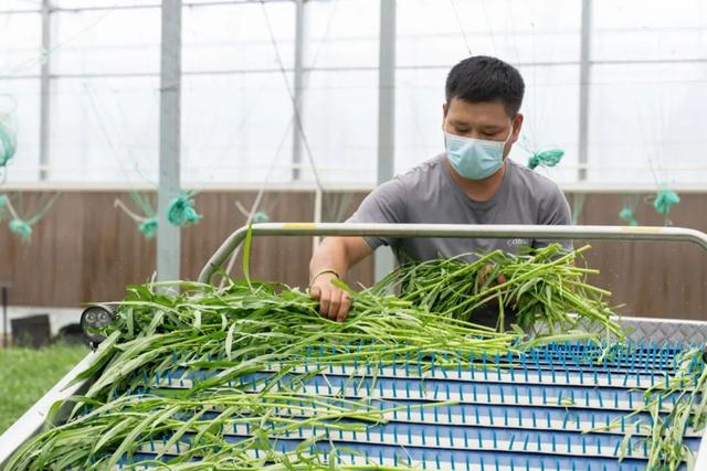 合作社大棚内,工作人员正操作着收割机,一排排新鲜的空心菜,从收割机的大斗里倾泻而出,很快几个大筐就被装满了。