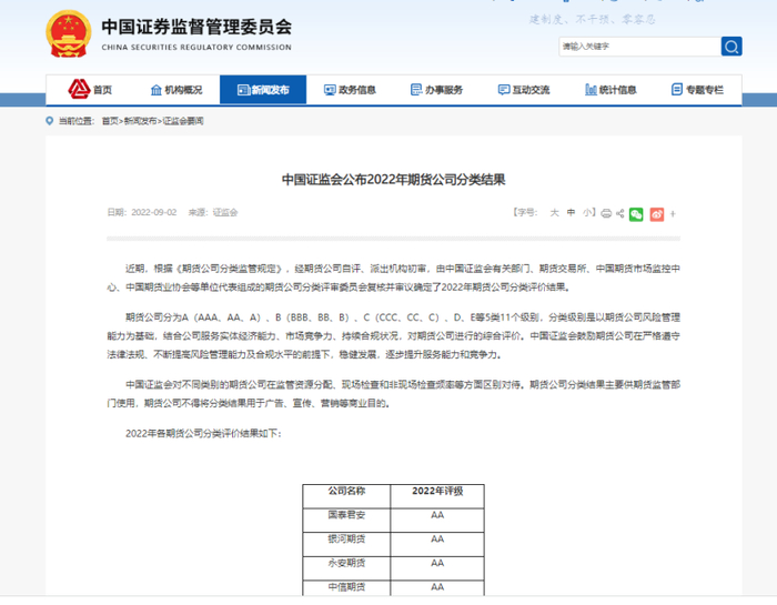 9月2日,证监会官网发布消息,今年获评A类的期货公司较去年增加15家,其中AA级增加1家,18家获评AA级的期货公司分别为国泰君安、银河期货、永安期货、中信期货、东证期货、华泰期货、南华期货、中粮期货、中信建投、申银万国、中泰期货、浙商期货、海通期货、广发期货、新湖期货、光大期货、招商期货、国投安信。