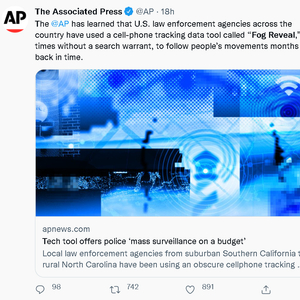 根据美联社的报道,这款正在被美国多个地方的警察局使用的手机用户信息追踪软件叫“Fog Reveal”,直译成中文叫“迷雾揭示”。