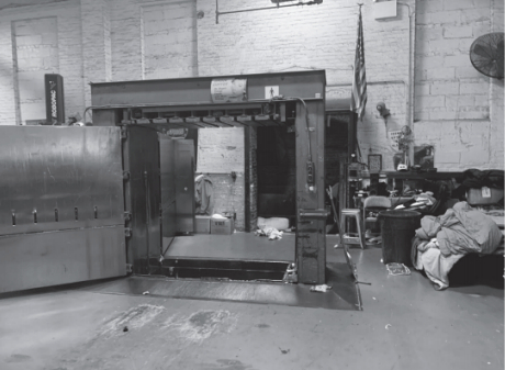 纽约市救世军的打包机。不能转售的旧衣物从分拣层的斜槽上滑下来,在这里被打包并运走。