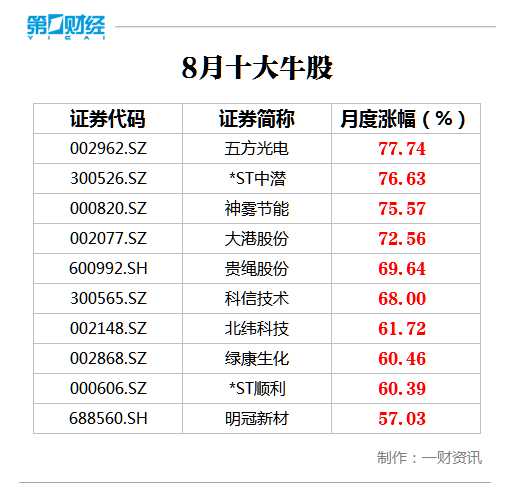 8月十大牛股出炉 五方光电近80%涨幅问鼎榜首