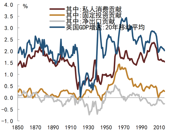 图表15:英国实际GDP增速及贡献构成(1850-2016)