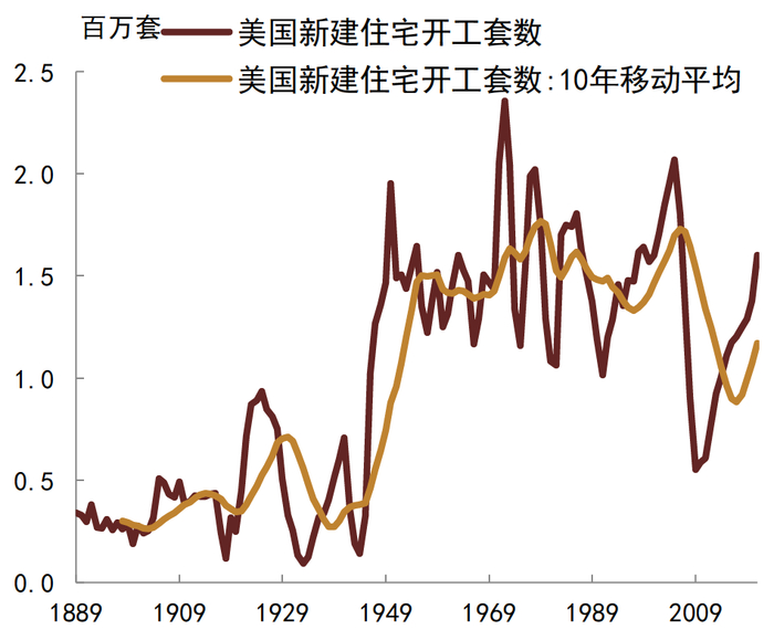 资料来源:美国人口调查局, CEIC, 中金公司研究部;注:1889-1958数据包含私人部门和公共部门,同时含农舍;1959年及之后数据不含公共部门,也不含农舍