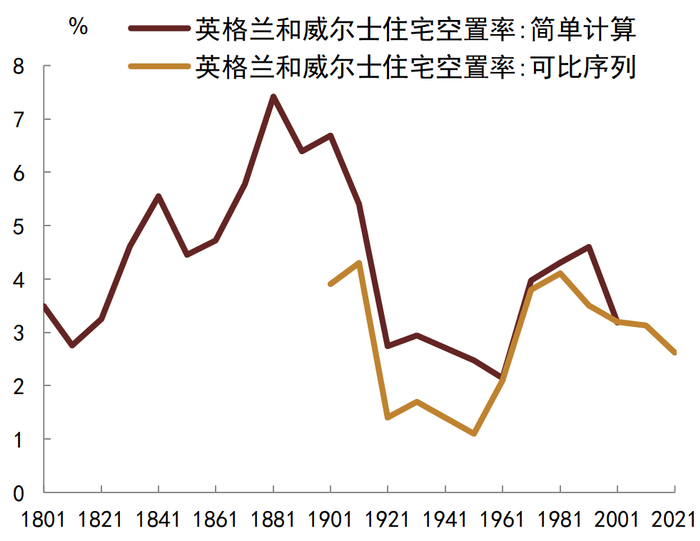 资料来源:Holmans 2005, ONS,中金公司研究部;注:1801-2001年数据来自Holmans 2005,2011和2021年数据为英格兰住宅空置率,数据来自ONS