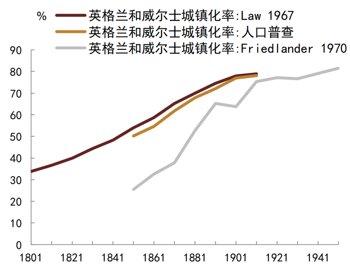 资料来源:Law 1967, Friedlander 1970, 中金公司研究部;注:详见Law 1967, The Growth of Urban Population in England and Wales 1801-1911; Friedlander 1970, The Spread of Urbanization in England and Wales, 1851-1951.