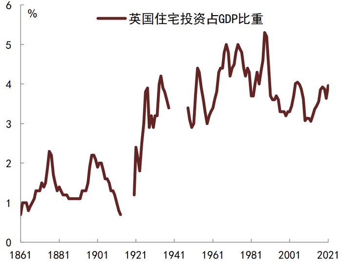 住宅空置率和住宅投资。在十九世纪城镇化持续推进过程中,英国住宅空置率总体是趋于上升的,而到二十世纪城镇化平稳阶段,住宅空置率则相对稳定,1901-2001年英格兰和威尔士住宅空置率平均处于3%附近(图11),到2021年英格兰住宅空置率不到3%(图12)。注意到在持续城镇化的十九世纪,英国住宅投资在经济中占比相对较低,1861-1913年住宅投资在GDP占比平均只有1.4个百分点,反而是一战以后住宅投资在经济中占比系统性上升,二战以后基本维持在4%附近(图13)。导致住宅投资占比这种变化的因素是多方面的,可能包括战争和人口因素,建筑结构和建筑成本因素,以及房屋维护因素等。二十世纪七十年代英国住宅竣工高峰过后,住宅投资在经济中占比从5%附近降至3%附近;同时新建住宅在住宅投资中占比持续下降,修缮维护相关更新投资在住宅投资中占比则上升至60%附近(图14)。