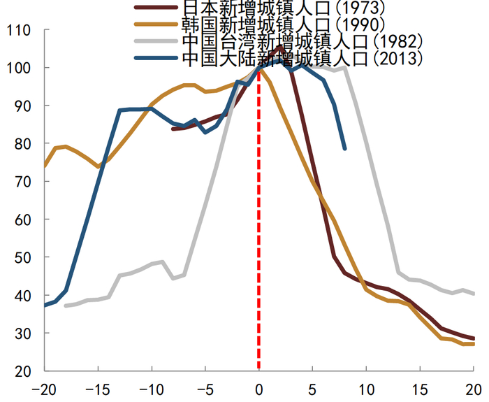 资料来源:各经济体统计局, CEIC, UN, 中金公司研究部;注:相关数据进行标准化处理,日本1973年为基准,横轴设为0,纵轴标准化为100,其他年份为相对1973年的相对数值;韩国1990年为基准,中国台湾1982年为基准,中国大陆2013年为基准;下文相关对比图表类似处理
