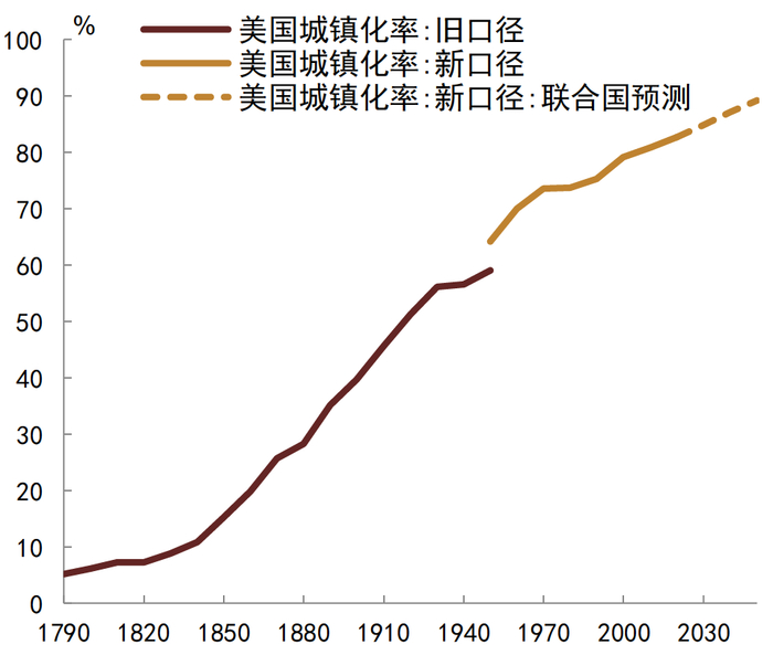 资料来源:美国人口调查局, UN, 中金公司研究部;注:1790-1940年数据为旧口径数据,1950年之后数据为新口径数据,2020年以后数据为联合国预测数据,详见图表2注