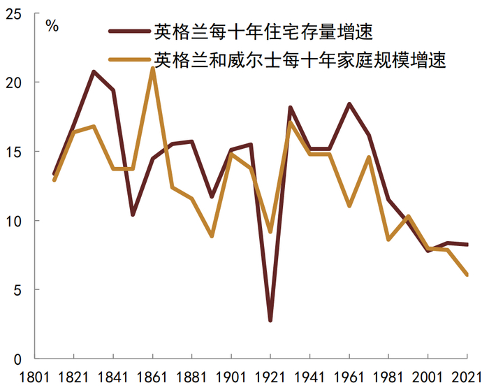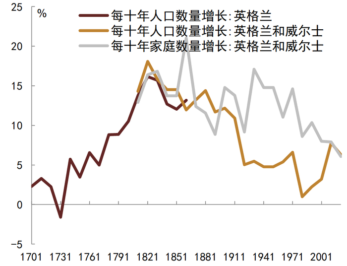 资料来源:ONS, BoE, Holmans 2005,中金公司研究部;注:1801-2001年英格兰和威尔士人口和家庭增长来自Holmans 2005, Historical Statistics of Housing in Britain; 2011-2021年英格兰和威尔士人口和家庭增长数据来自Office for National Statistics; 1701-1861年英格兰人口增长来自Bank of England, A millennium of macroeconomic data.