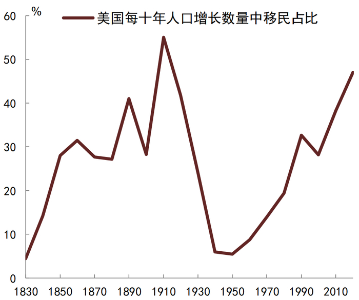 图表20:美国人口数量增长中移民占比(1830-2020)