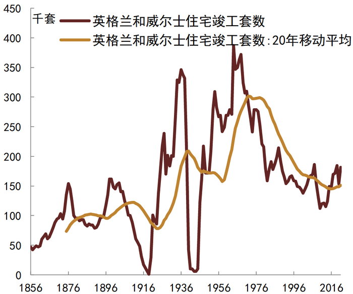 房地产市场发展。在城镇化和家庭规模增长背景下,英国房地产市场也持续发展。在十九世纪持续城镇化阶段,英格兰和威尔士住宅竣工数量也持续上升;进入二十世纪城镇化率趋稳,但是家庭规模仍在快速增长,这继续支撑住宅竣工规模快速增长,直到二十世纪六七十年代之前,英国每年住宅竣工套数与家庭数量比值的中枢基本处于1.5%-2%之间;二十世纪七十年代之后,英国每年住宅竣工数量明显下滑(图7、图8)。从英国近二百年的房地产市场发展,我们可以得到一些有益的启示:一是住宅存量增长基本与家庭规模增长一致,这反映了住宅的居住本质(图9);二是房地产表现出20-30年的周期性特征,背后核心是人口结构因素;二是城镇化过程中住宅总量是偏紧的,体现为较长一段时间英国平均每户家庭拥有住宅套数处于1以下;三是每户家庭拥有住宅套数趋于上升,但是上升空间则受到空置率约束(图10)。