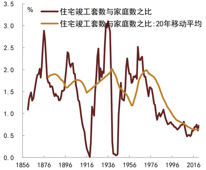 房地产市场发展。城镇化推进和家庭数量增长过程中,住房需求自然也快速增长,在城镇化快速推进的1890-1930年,美国每年新屋开工数量与家庭数量之比平均达到2%;经历大萧条和二战之后,美国房地产市场快速发展,1946-1973年新屋开工与家庭数量之比更是达2.9%,新屋开工绝对规模更是处于高位;二十世纪七十年代之后,新屋开工与家庭数量之比的中枢值逐步下降1%附近,次贷危机期间更是跌至0.5%附近(图23、图24)。从美国房地产市场发展来看,住宅存量增长也基本与家庭数量增长保持同步(图25),这与英国情况较为类似;平均每户家庭拥有住宅套数逐步增加(图26),并伴随住宅空置率的逐步上升(图27);美国户均住宅套数基本稳定在1.1附近,住宅空置率也大体如此,这反映住宅的居住特性对住宅存量增长的限制;二十世纪五十年代之后美国住宅自有率明显上升,其后稳定在65%附近(图28)。