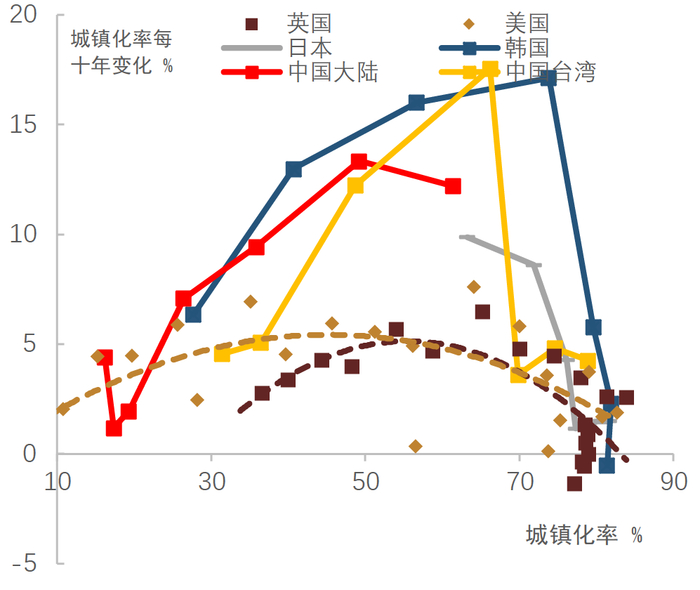 资料来源:各经济体统计局, CEIC, UN, 中金公司研究部注:横轴为各经济体的城镇化率水平,纵轴为各经济体每十年城镇化率的变化值;