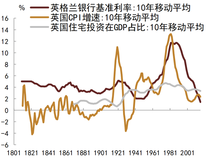 经济和利率中枢。一个很有趣的现象是,在城镇化和人口变化驱动房地产发展过程中,英国的经济增长中枢并没有明显变化。在城镇化较快阶段的1831-1900年,英国实际GDP平均增速约2.1%,不考虑两次世界大战及大萧条时期,1945-2016年英国实际GDP平均增速约2.4%,城镇化和房地产似乎对英国经济增长中枢影响有限(图15)。二战后的1951-1970年,住宅投资增速较高,投资对经济贡献较大,不过长期来看,经济增长是靠消费驱动,投资只是阶段性力量。通胀变化则较多体现了货币的力量,从金本位时期的低通胀到信用货币时期的高通胀,通胀基本与广义货币同步波动(图16)。在金本位时期,房价勉强跑赢CPI,却大幅跑赢广义货币,而在信用货币时代,房价勉强跑赢广义货币,却大幅跑赢CPI(图17)。就长期利率走势来讲,更多是体现了通胀的影响(图18)。
