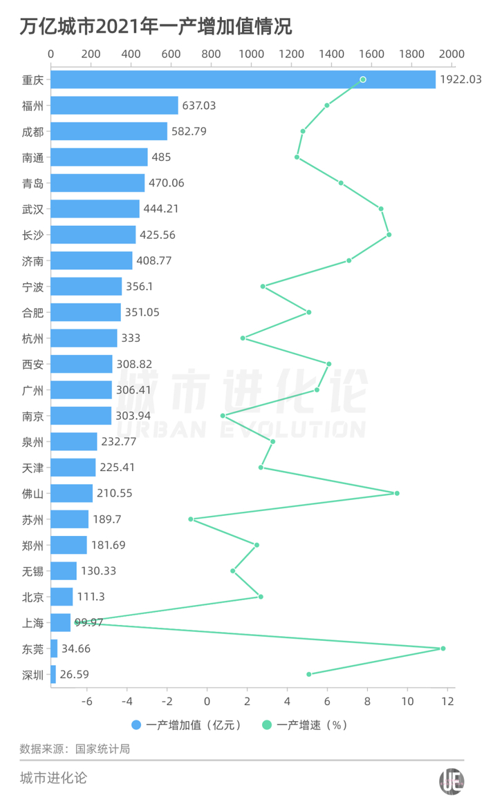深圳恰似成都的“对立面”。以48.1%的建成区面积占比高居全国城市前列的深圳,2021年一产增加值仅为26.59亿元,在万亿城市中排名末位。这意味着,深圳不具备像成都这样的蔬菜供应条件。