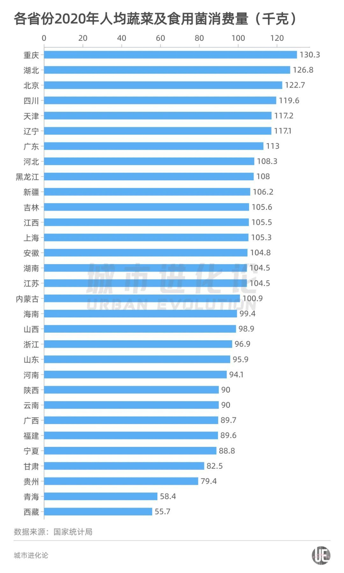 从国家统计局公布的2020年数据来看(2021年数据暂未公布),蔬菜及食用菌人均消费量最高的5个省份依次是重庆、湖北、北京、四川、天津,均超过117千克。