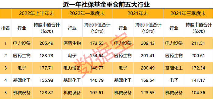 数据宝统计,上半年末社保基金对电子、医药生物行业的持股家数均为51家,另外三大行业持股家数均超40家;社保基金持有电力设备行业的市值在200亿元以上,另四大行业持股市值均超百亿元。这五大行业中,社保基金合计持有234家公司,持股市值851亿元,占社保基金持股总家数及总市值的比例均为44%左右。