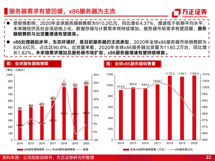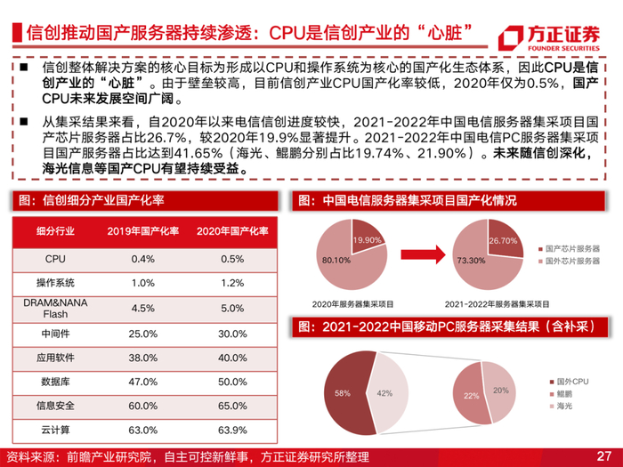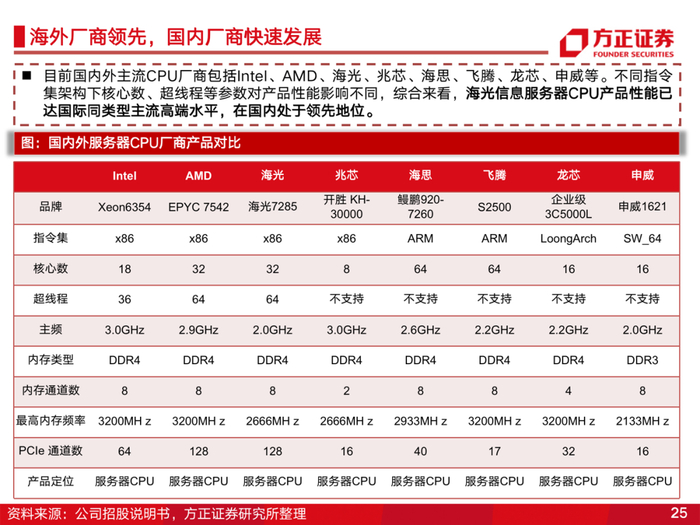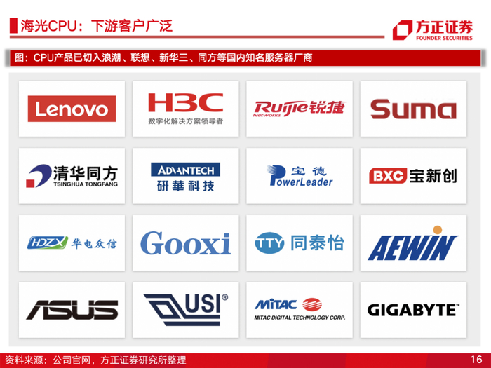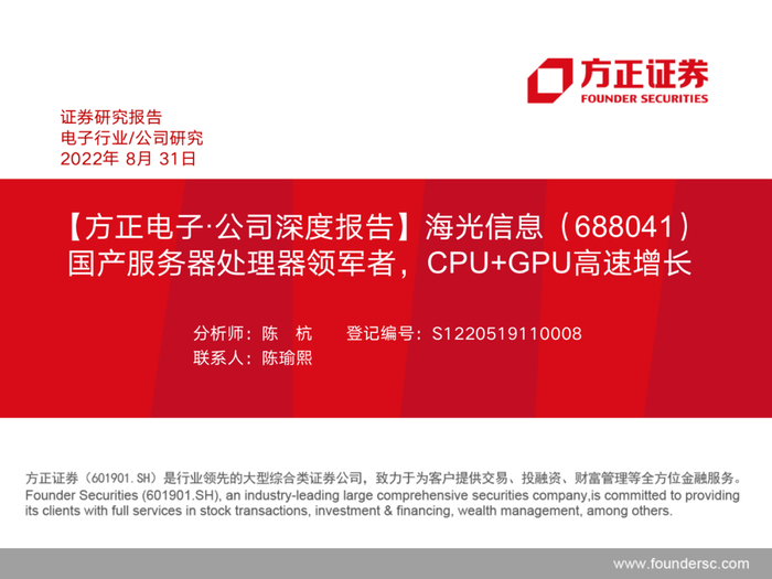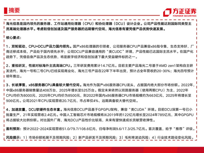 海光信息是国内领先的服务器、工作站通用处理器(CPU)和协处理器(DCU)设计企业。公司产品性能达到国际同类型主流高端处理器水平。考虑到信创加速及国产服务器的远期替代空间,海光信息有望凭借产品优势快速发展。