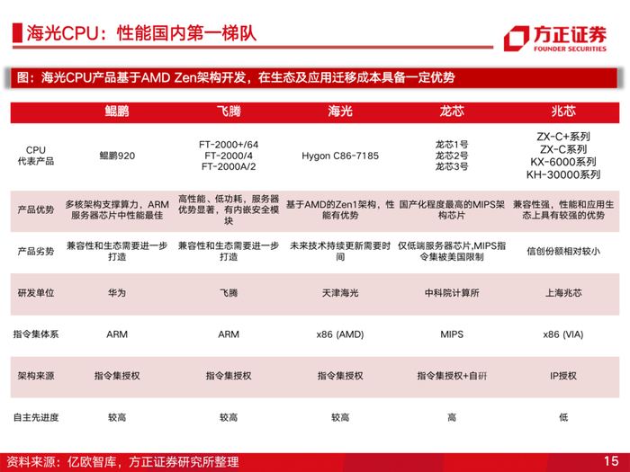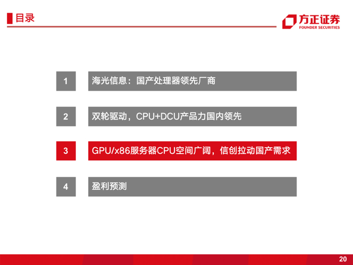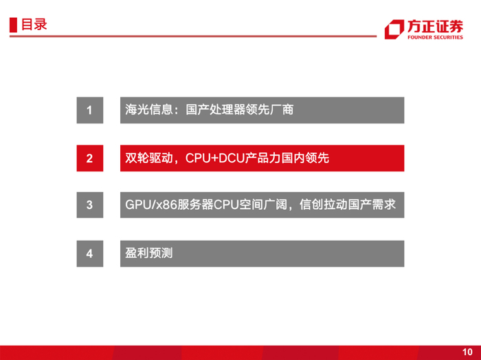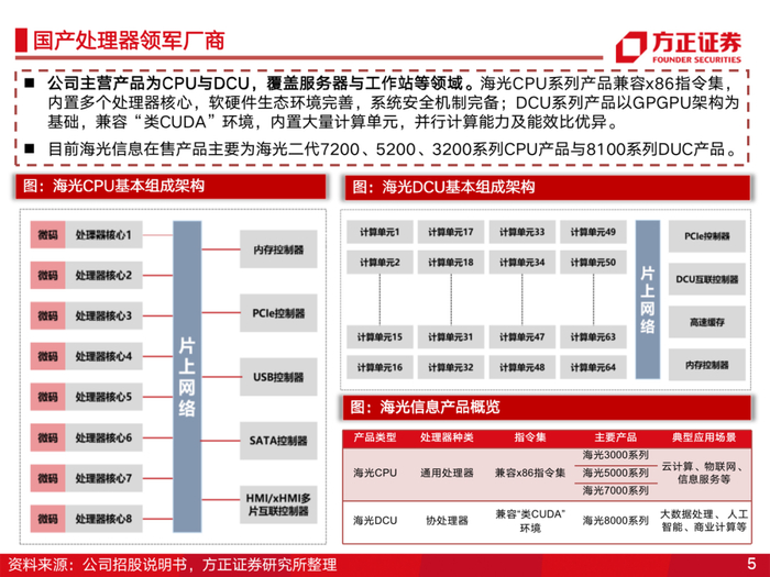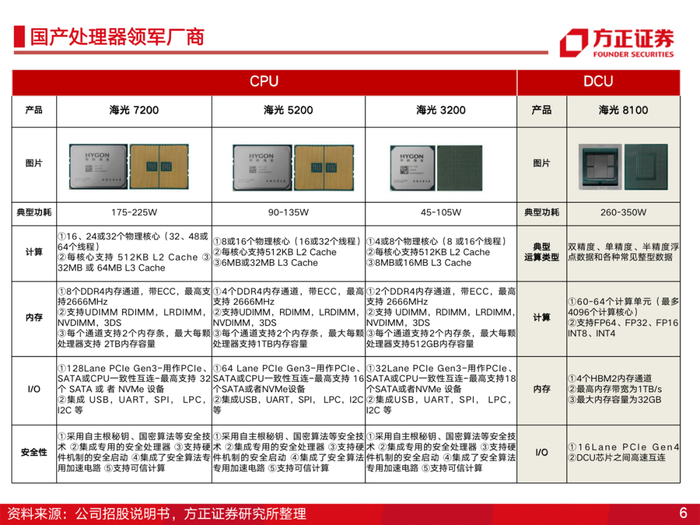1、双轮驱动,CPU+DCU产品力国内领先。国产x86处理器的引领者,公司服务器CPU产品兼容x86指令集,生态支持好,厂商迁移成本低,产品处于国内领先水平;公司DCU产品兼容通用的“类CUDC”环境,产品性能已达国际主流水平。在国产化趋势下,凭借自身产品及生态优势,将是数字经济和信创加速下最大受益硬件标的之一。