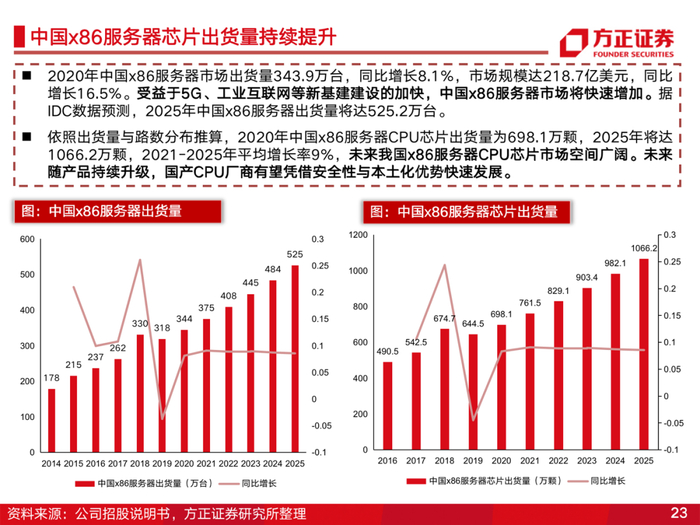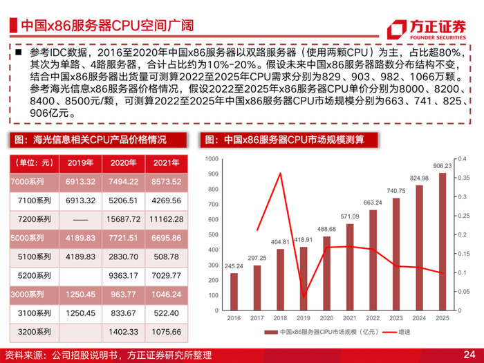 3、长坡厚雪,x86服务器CPU具备较大替代空间。海光作为国产x86服务器CPU龙头,占据国内绝大部分市场份额。2022年,中国x86服务器销售量达408万台,2025年增长至525万台。假定未来依然以双路服务器(使用两颗CPU)为主,2022年CPU均价为8000元,2025年CPU均价为8500元,则2022年国内x86服务器CPU市场规模约为663亿元,2025年将增长至906亿元。公司2021年CPU实现营收20.7亿元,市占率仅4%,远期具备较大替代空间。