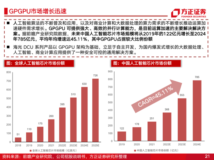 4、加速放量,DCU软硬件生态丰富。海光信息DCU产品基于GPGPU架构,兼容“类CUDA”环境。目前DCU深算一号已小批量生产,21年实现营收2.4亿元。中国人工智能芯片市场规模将从2019年的122亿元增长至2024年785亿元,其中GPGPU将占据较大比例份额。对比国外厂商,海光DCU产品性价比较高,未来有望快速成长贡献营收弹性。