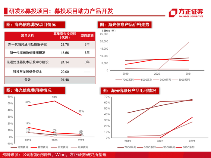 2、重视研发,性能对标海外主流高端CPU。三年研发费用累计14.7亿元。目前主要产品海光二号基于AMD zen1架构自主研发迭代,海光一号和二号CPU已经实现商业化,海光三号产品在22年下半年出货,预计占全年营收的20-30%;海光四号预计明年推出。
