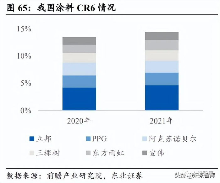 消费建材成长逻辑不改。消费建材由于其行业准入门槛低、存在运输半径等原因而 属于典型的“大行业小企业”,行业内企业数量众多,集中度低,品牌、产品、运营 效率具备优势的龙头企业发展前景广阔。周期低位加速行业集中。在下游地产需求下行,原料成本高企,能耗管控趋严的行 业下行周期形式下,落后产能有望加速出清,行业竞争格局优化。涂料 2021 年 CR6 提升 0.95pct 至 14.36%,其中份额提升最高的是立邦/东方雨虹/三棵树,分别提升 0.43%/0.39%/0.16%。陶瓷 2021 年 CR4 提升 1.15pct 至 8.99%,其中蒙娜丽莎提升 0.68%至 2.21%。