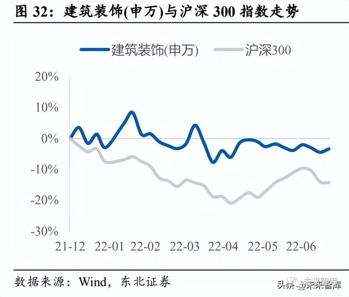建筑行业今年持续走强,六月受风格切换影响超额收益收窄。以 2021 年 12 月 31 日 起的周度数据进行分析,1 月至 5 月,大盘整体处于震荡下行态势,建筑行业横盘 调整,相对沪深 300 指数形成一定超额收益。超额收益于 4 月~5 月处于 15%左右的 相对高位。6 月份,前期回调幅度较深板块快速反弹,建筑行业继续横盘调整,相 对沪深 300 指数超额收益收窄至 10%以内。截至 7 月 22 日,建筑行业超额收益略 微扩大至 11%。