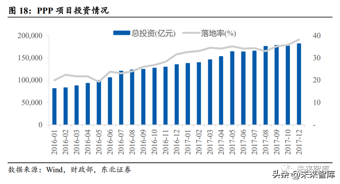 乘历史机遇,PPP 迅速发展,基建投资保持高增长。我国的 PPP 模式(Public-Private Partnership,政府和社会资本合作)首次提出于 2014 年 3 月份财政部发布的《2014 年中央和地方预算草案》,后经持续的试点和完善。2016 年 2 月 2 日,国务院发布 《国务院关于深入推进新型城镇化建设的若干意见》,放宽了社会资本参与基建投 资的准入条件。PPP 模式迅速推进,总投资与项目落地率持续走高;截止 2017 年 度,总投资达 18.2 万亿元,同比增长 34.8%;PPP 项目落地率达 38%,同比提高 6pct。受 PPP 模式等利好推动,我国基建投资保持高增长,2015 年~2017 年维持 15% 以上增速,2017 年全年完成投资 14 万亿(不含电力口径)。