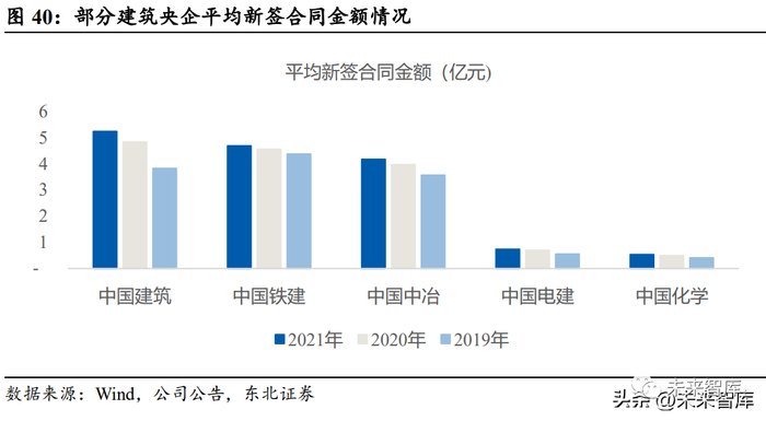 项目逐渐大型化综合化,建筑央国企竞争优势或进一步增强。我国建筑工程总承包 项目逐渐转变为以 EPC(设计+采购+施工)、DB(设计+施工)模式为主,项目逐渐 大型化、综合化。从 2019 年至 2021 年完整披露新签订单情况的中国建筑等建筑央 企来看,其新签项目平均合同金额均出现上升趋势。如中国建筑 2021 年平均新签合 同金额为 5.25 亿元,较 2019 年增长了 37%;中国化学 2021 年平均新签合同金额为 5421 万元,较 2019 年增长了 34%;中国电建 2021 年平均新签合同金额为 7436 万 元,较 2019 年增长了 32%。我们预计,凭借资本实力和经验技术优势,建筑央国企 在未来竞争优势或进一步增强。