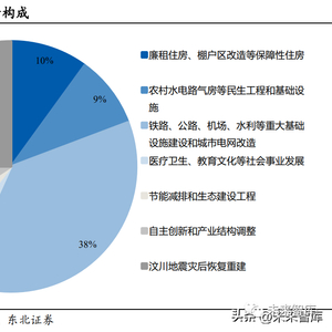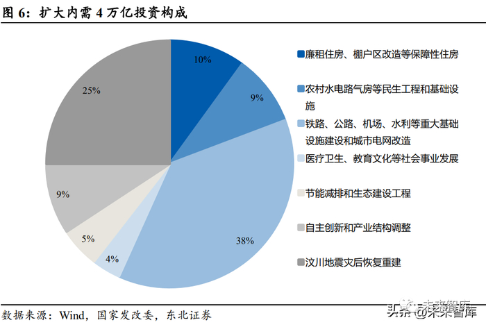 货币政策转向宽松,4 万亿投资计划刺激经济。2008 年 9 月 15 日,央行宣布自次日 起降准,标志着货币政策转向宽松。自 2008 年 9 月到 2008 年底,央行五次下调存 贷款基准利率,四次下调存款准备金率。从 2008 年四季度到 2010 年底,中央政府拟新 增投资 1.18 万亿元,加上地方和社会投资总规模共约 4 万亿元。4 万亿投资计划中, 铁路、公路、机场、水利等重大基础设施建设和城市电网改造占比最高,达 38%, 其次是汶川地震灾后恢复重建,达 25%。