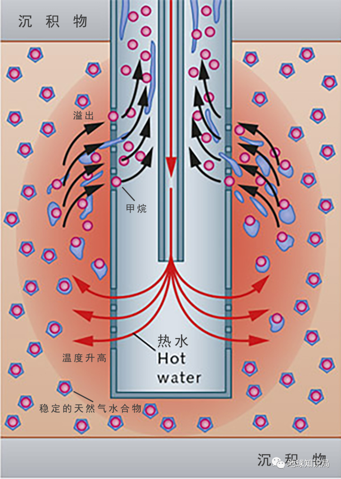 2002年加拿大率先在北极冻土区利用注热法试采可燃冰。这种方法利用可燃冰20℃时气体分子就会溢出的特性,直接加热天然气水合物层,促使天然气溢出。这是最初级的方法。