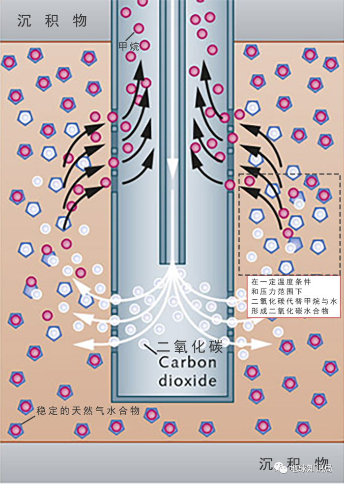 2012年,美国试验了二氧化碳置换开采法,在一定的温度和压强下注入二氧化碳,与水结合置换出甲烷。二氧化碳水合物形成会放热,进一步促进可燃冰分解。这种操作不但采集了甲烷,还封存了二氧化碳,而且更安全,就是难度系数太大,暂时没有商业化前景。