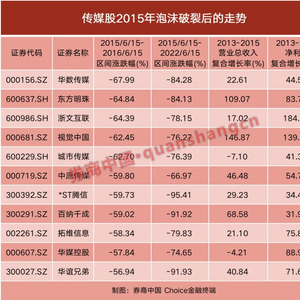 传媒行业的高成长性受到了市场的追捧。在2012年至2015年期间,华谊兄弟、百纳千成、浙文互联、华数传媒等多只传媒个股涨幅约为10倍。但在2015年泡沫破裂后短短一年的时间中,这些个股跌幅均超过50%。自2015年中期以来,当初的龙头股如华谊兄弟和百纳千成更是跌幅超过90%。