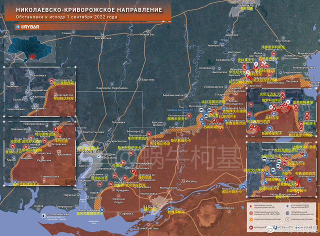 在赫尔松主攻方向,乌军本轮攻势主要是在赫尔松四个方向展开:赫尔松-尼古拉耶夫的沿海一侧,乌军试图夺回8月中旬被俄军蚕食的底盘;尼古拉耶夫—赫尔松的直线公路,乌军试图沿着主路扩大控制区;因古列次河方向的苏霍伊-斯塔沃克村方向,乌军试图打到河边公路干扰俄军南北向补给线;以及赫尔松战区东北部奥利吉涅-维索科皮利亚方。