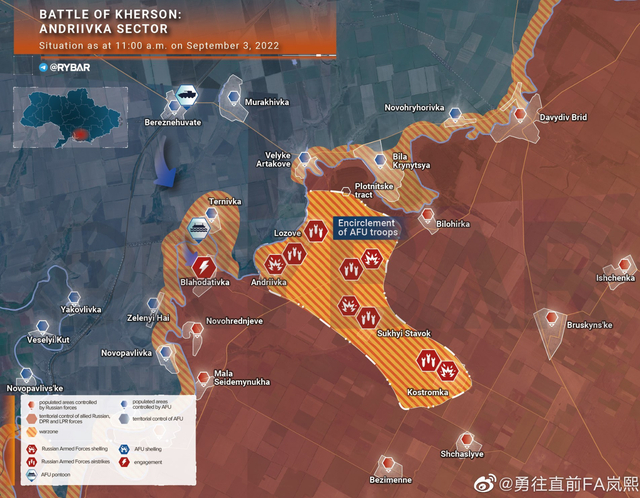 从8月份开始,这些旅一级部队的集结地也遭遇了俄军远程导弹的打击,遭到了一定程度的重创。此外俄空天军和远程炮兵部队开始打击乌军的弹药库和后勤节点,进一步阻碍了攻势,乌军为此不得不将攻势推迟到9月底才进行发动。在这期间,俄军也通过克里米亚向赫尔松方向增兵,进一步加大了乌军反攻的难度。