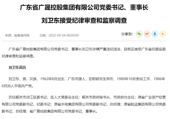 9月4日上午,广东省纪委监委发布通报,广东省广晟控股集团有限公司党委书记、董事长刘卫东涉嫌严重违纪违法,目前正接受广东省纪委监委纪律审查和监察调查。