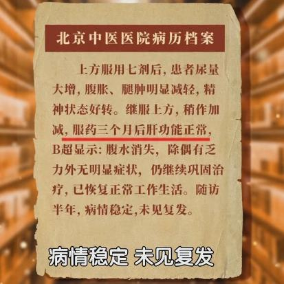 关老曾经用三个月的时间就将一位肝硬化晚期的患者,调整到正常的状态,腹水、水肿消失,肝功能指标正常,随访半年病情稳定,恢复正常工作,未见复发。