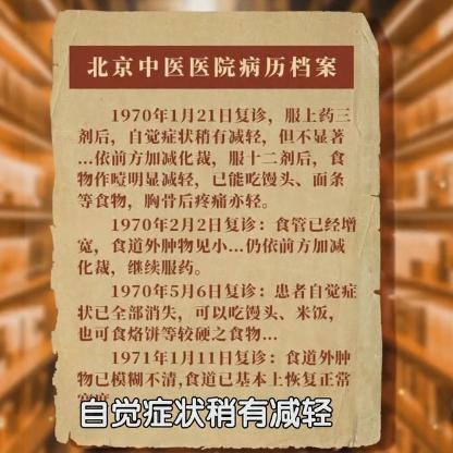 关老用一个方子加减化裁,患者服几次药后,症状很快就减轻,能吃馒头和面条等,胸骨后疼痛也减轻了,继续治疗一个多月,食管肿物变小,等一年左右,肿物消失,食道基本恢复正常。