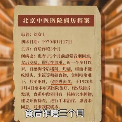 患者刘女士在食管里发现了一个核桃大小的肿物,导致她吞咽困难,三个月来都只能喝粥,不能吃米饭、馒头、烧饼等,否则会噎堵难下,甚至呕吐。