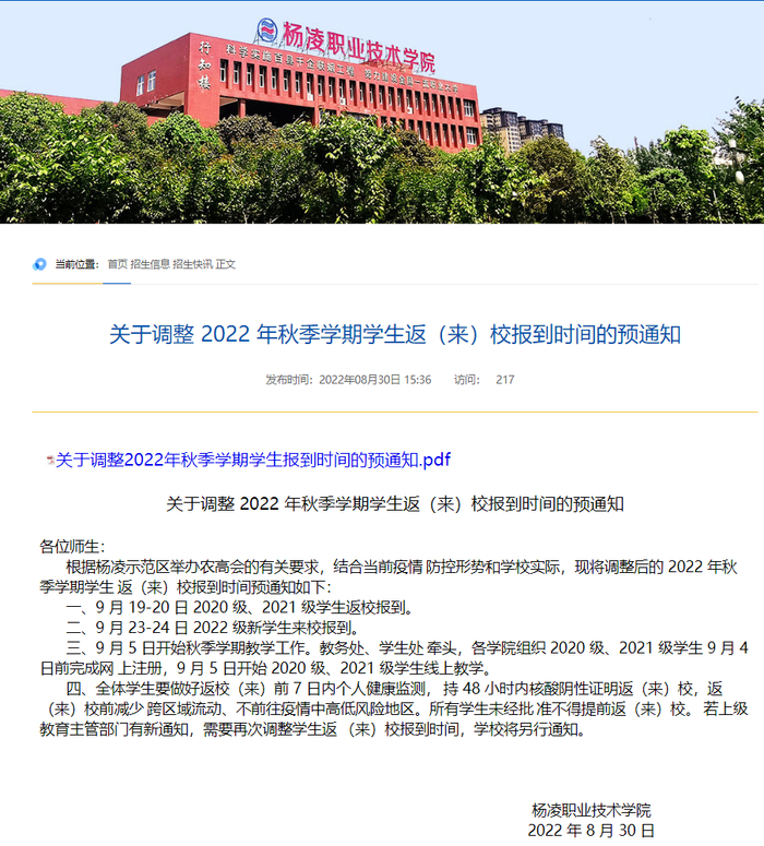 根据杨凌示范区举办农高会的有关要求,结合当前疫情防控形势和学校实际,现将调整后的 2022 年秋季学期学生返(来)校报到时间预通知如下: