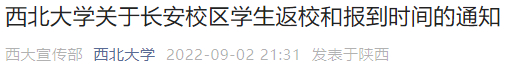 据西北大学消息,按照属地疫情防控要求和上级教育主管部门批复意见,经学校研究,现将长安校区学生返校、新生报到时间等有关事项通知如下。